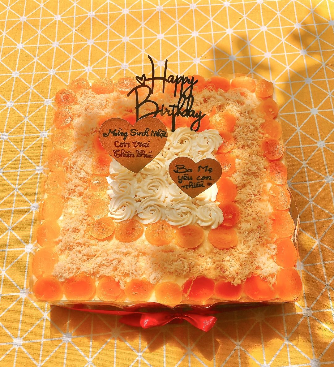 - Bao gồm 2 lơp sốt bơ trứng, 1 lớp trứng nghiền phủ đều, trứng nguyên, phomai lát và chà bông. Cốt bánh gato chiffon mềm, ít ngọt. Sốt bơ trứng thơm bơ,Trứng muối bùi, chà bông mặn vừa, và phomai ngậy. Đặc biệt, cốt bánh này để tủ lạnh không bị khô cứng mà vẫn mềm.